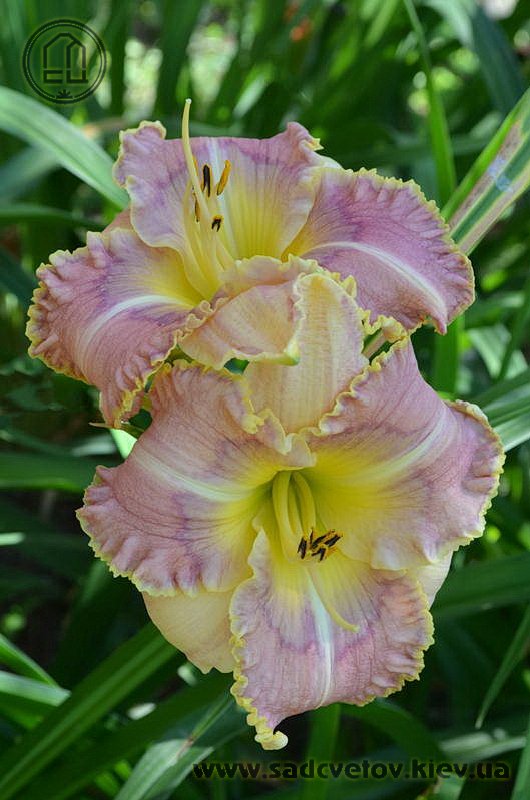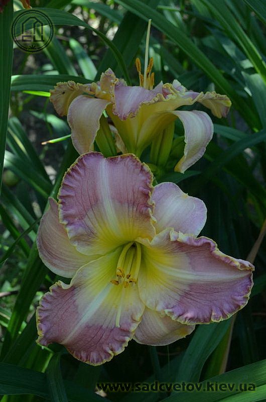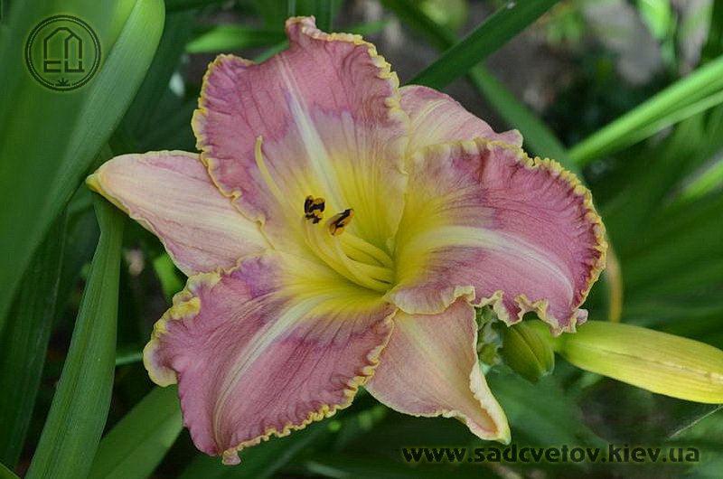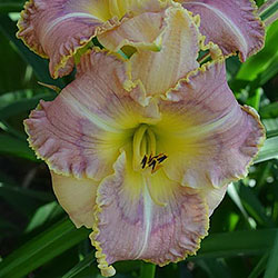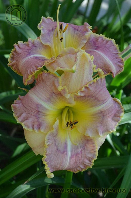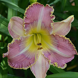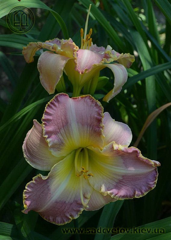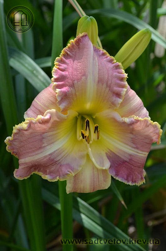 Гофрований ніжний блідо-рожевий з великим перламутровим оком окресленим насиченням фонового кольору, жовта тонка облямівка по краю, жовте горло.