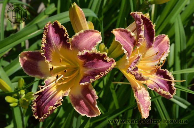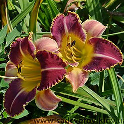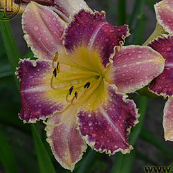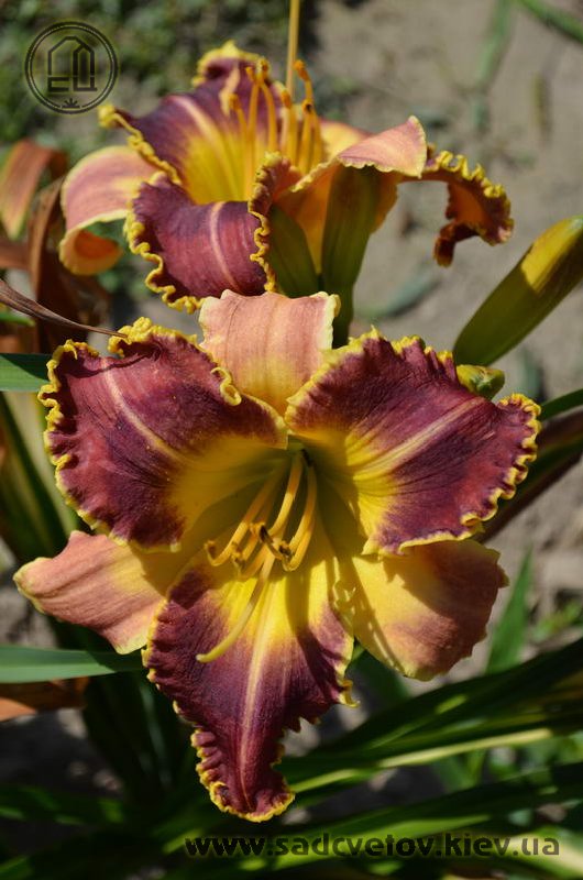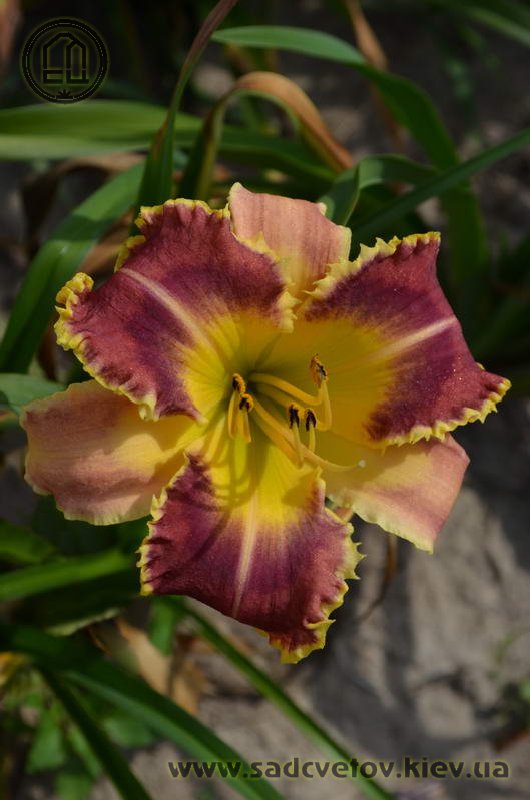 Цегляно-малиновий колір основних трьох пелюсток в поєднанні з блідо-рожевим інших трьох, бордове око розсічене білими променями з великого лимонного горла, лимонна зубчаста облямівка.