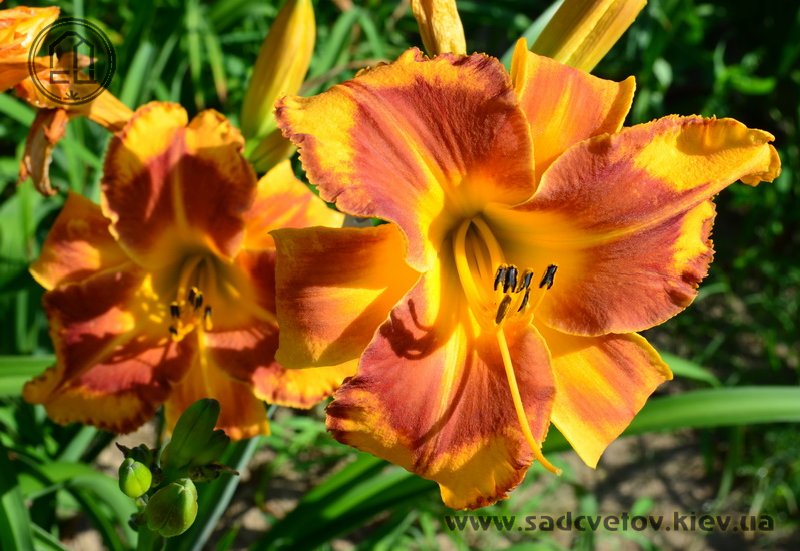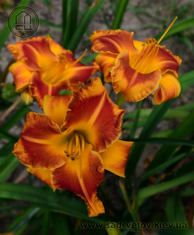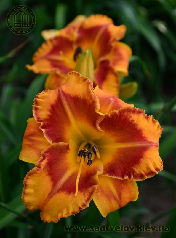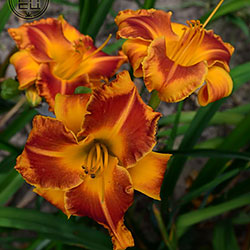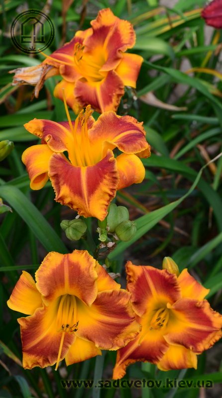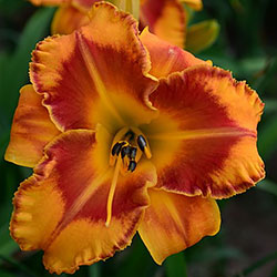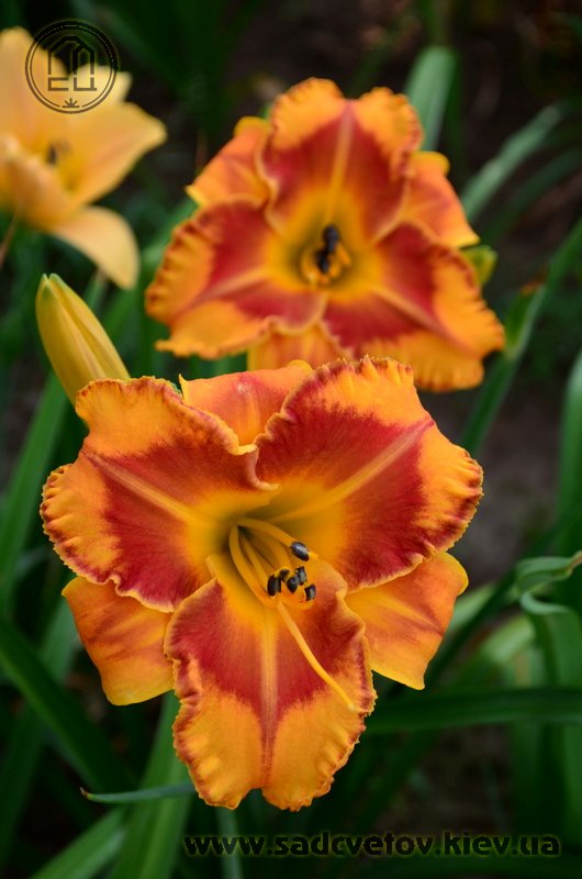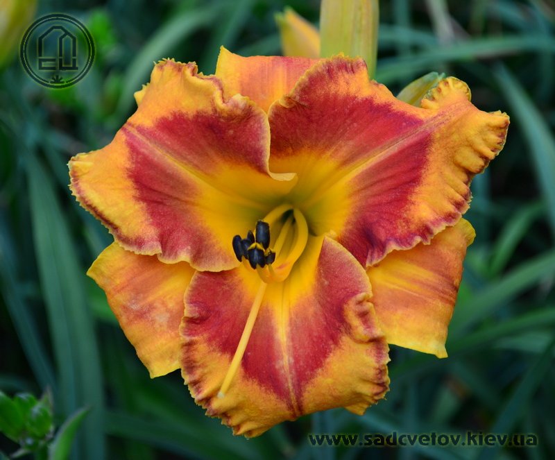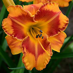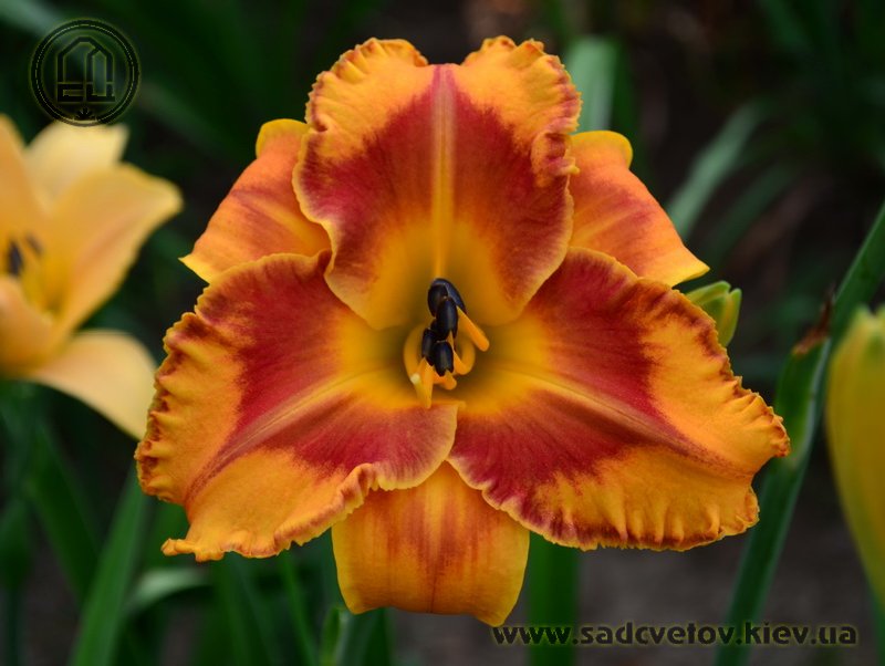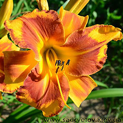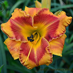 Контрастний виразний помаранчевий з великим на більшу половину пелюстки яскравим насиченим червоним оком і такою же тонкою червоною і золотистою облямівкою по гофрованому краю .