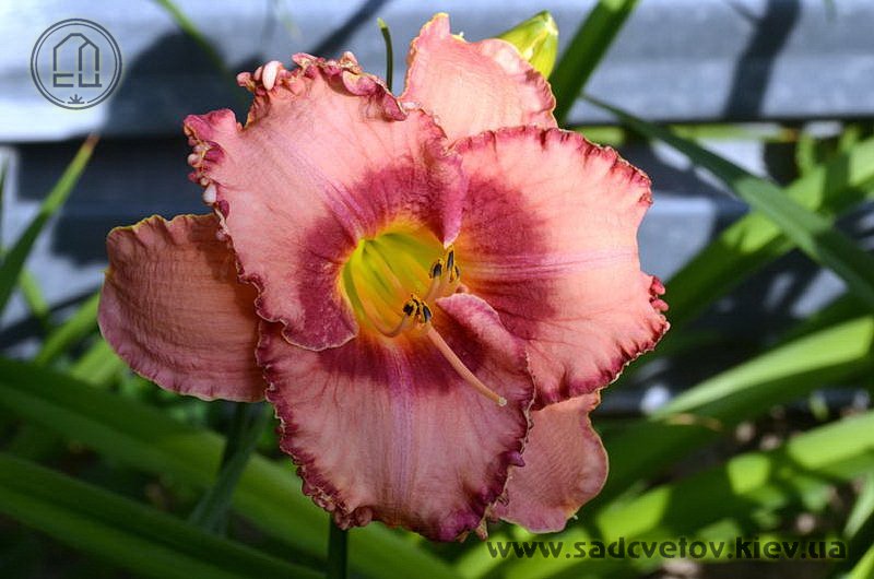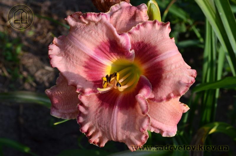 Акуратний гофрований молочно-рожевий з яскравими карміновими оком і тоненькою облямівкою по краю пелюсток, лимонно-зелене горло.
