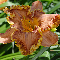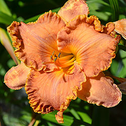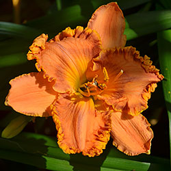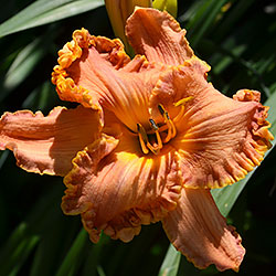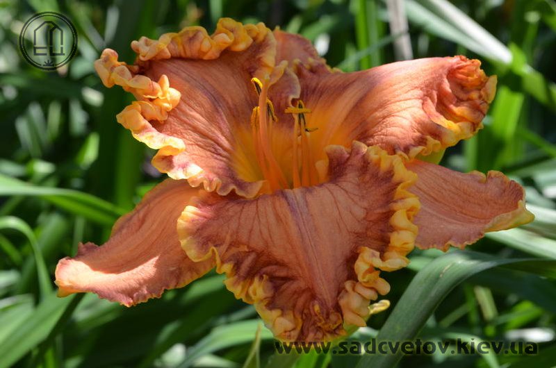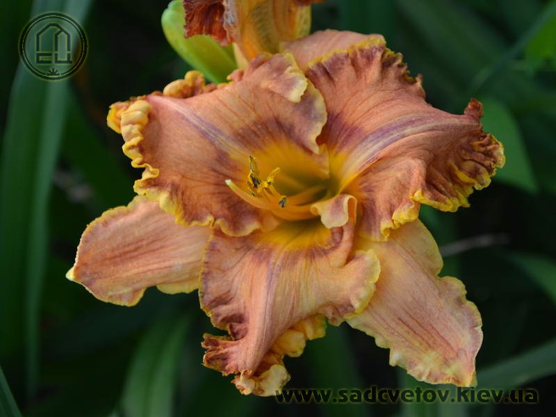 Супергофрований рожево-абрикосовий з невеликим малиновим вічком навколо оранжевого горла і легкою облямівкою ока окресленою золотисто-жовтими рюшами гофрування по краю.