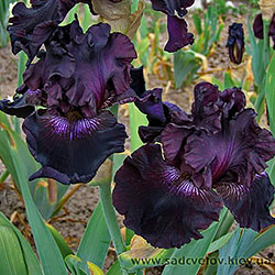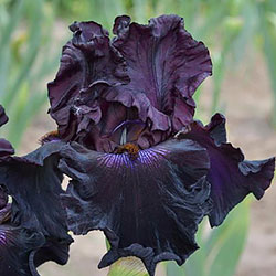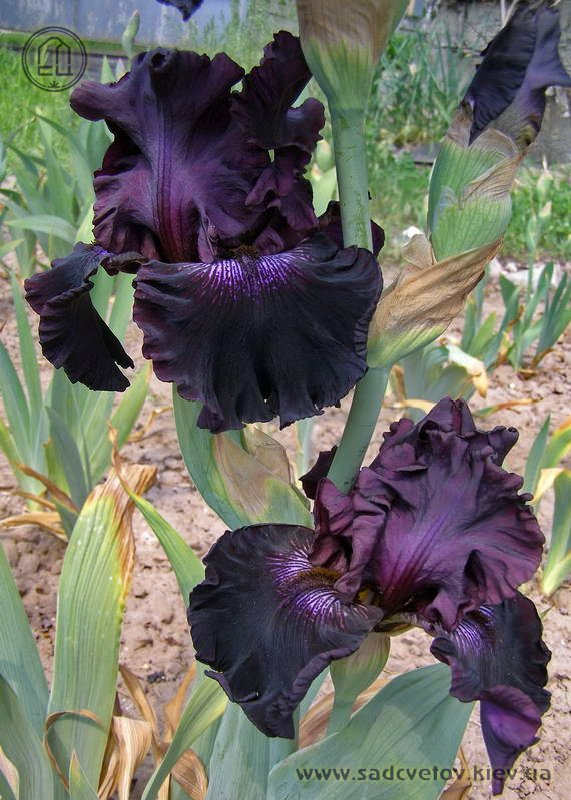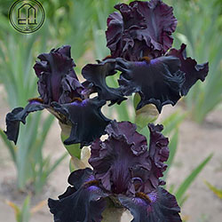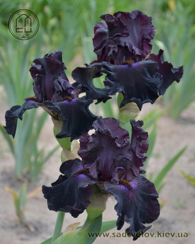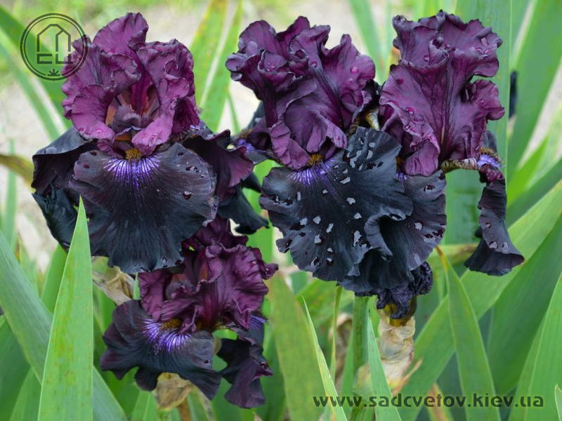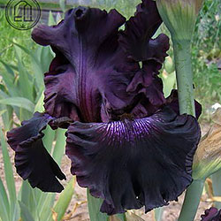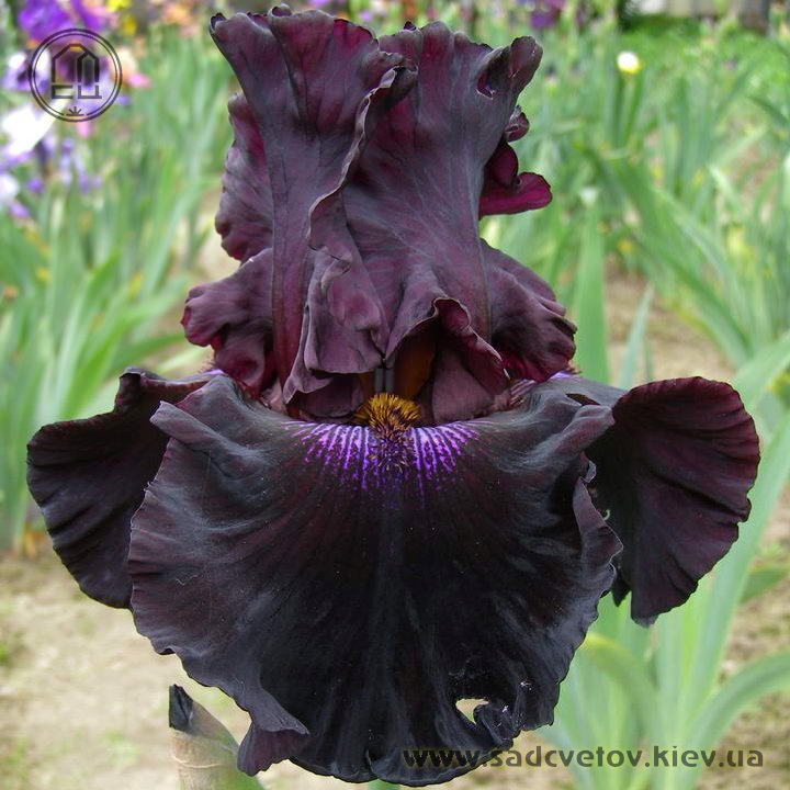 Сильний гофрований вишнево-чорний красень. Ф. темніші з невеликим біло-фіолетовим малюнком у червоно-вохристих б.