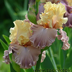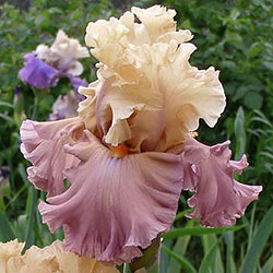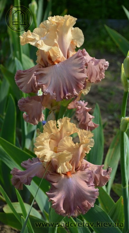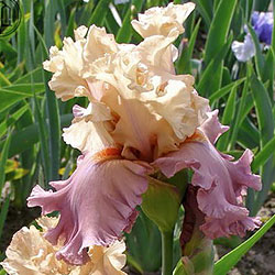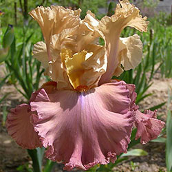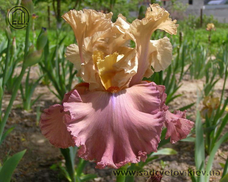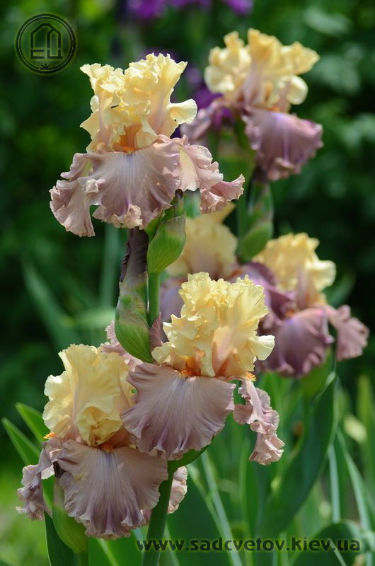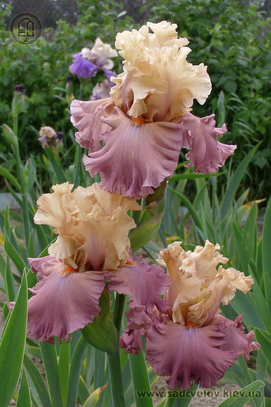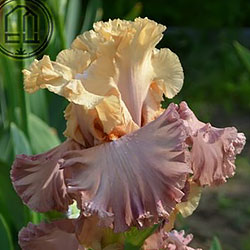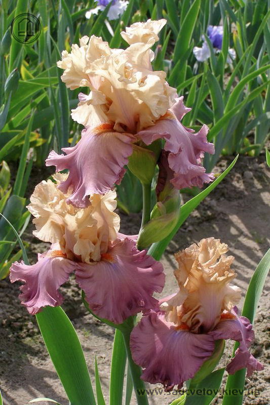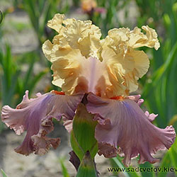 Великі супергофровані квіти на добре розгалужених стеблах.Ст. - абрикосові з невеликим фіолетовим вливанням. Ф. - вершково-кавові з легким вливанням лаванди і маленьким синім полум'ям нижче мандаринових б ..