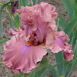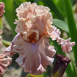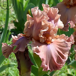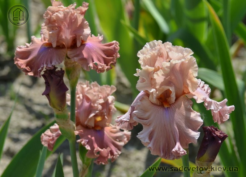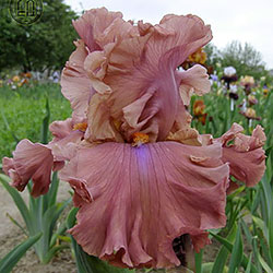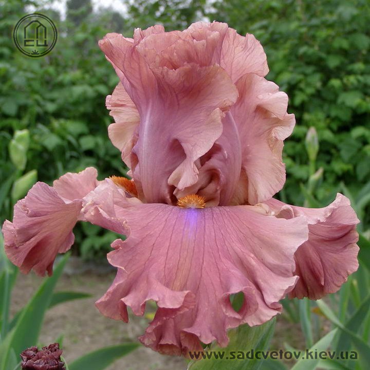Великий супергофрований, злегка мереживний. Широкі малиново-теракотові квіти з маленьким фіолетовим полум'ям на ф. нижче яскравих мандаринових б..