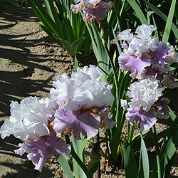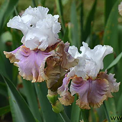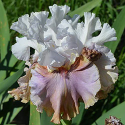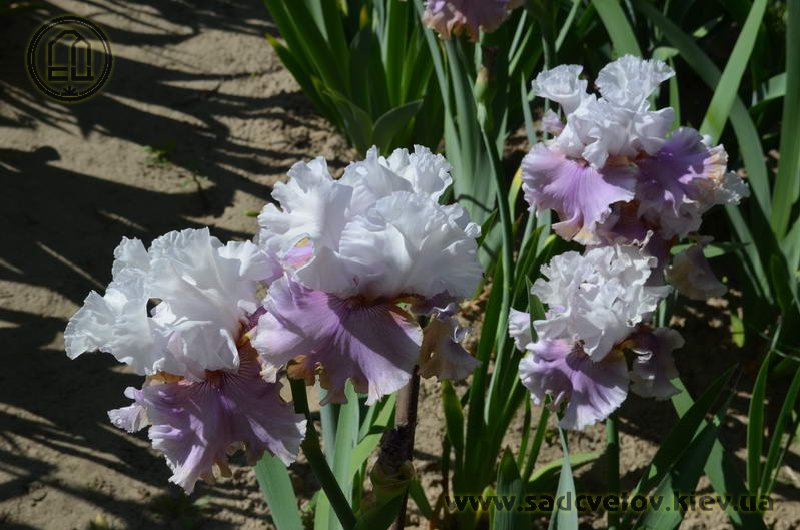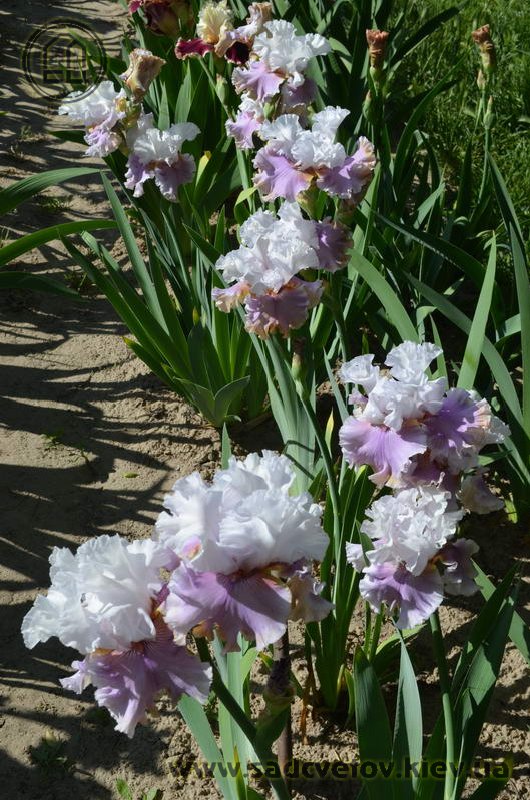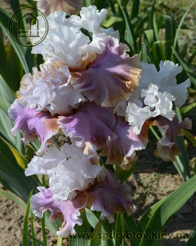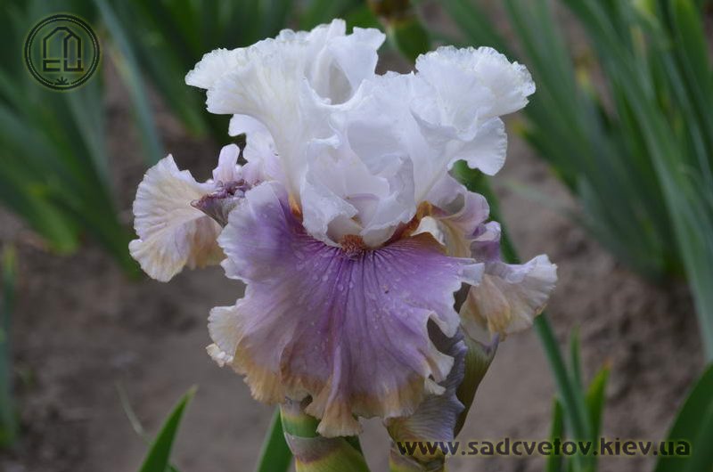 Велика, добре гофрована квітка. Ст. - білі з легким розгалуженням золотистих прожилок і тонкою золотистою облямівкою по краю, ф. - світло-фіолетові з золотистою окресленої коричневим облямівкою по формі серпа знизу фол, з білим краєм з боків і золотистими плечима, візерунок білих прожилок з боків від помірної оранжевої в кінчиках б.