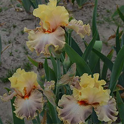Прекрасне гофрування. Ст. - абрикосово-персикові з рожево-лавандовим рум'янцем в середніх жилках, по пастельних абрикосово-кавового фону фолл від борід не досягаючи 1/3" до краю лавандовий візерунок прожилок. Під мандариновими б. невеликий синій вогник.