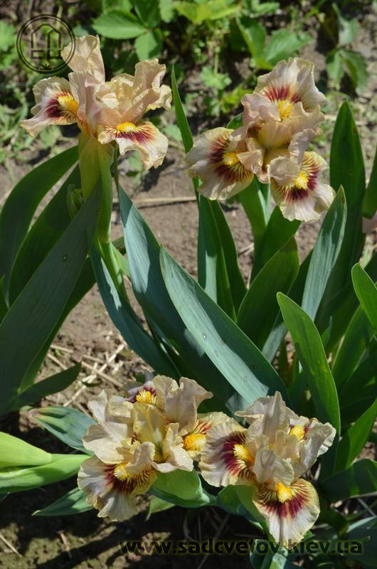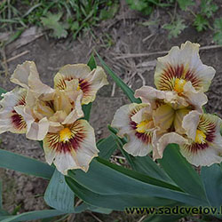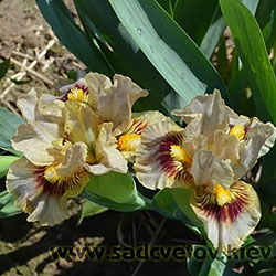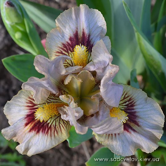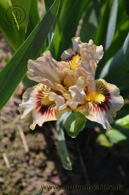 Гофрована квітка. Ст. - дуже світлий зеленувато-лавандовий з помітними темними прожилками, серединка як стандарти з зеленувато-жовтими включеннями, ф. - як стандарти з темною коричнево-бордовою плямою навколо бороди, яка розріджується на прожилки в жовтуватих плечах. Б. - яскравий жовтий з білим в основі, більш вираженим на кінчику.