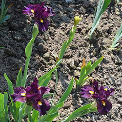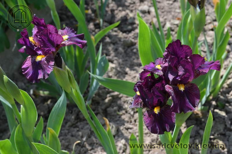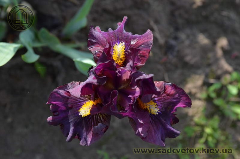 Темно-фіолетова гофрована квітка з золотистими включеннями в серединці, ф. з вишневими боками і смугастим візерунком білих, жовтих і фіолетових прожилок біля жовтої з білою основою б.