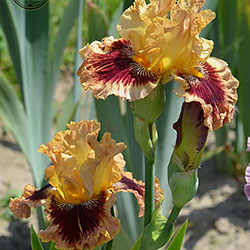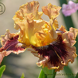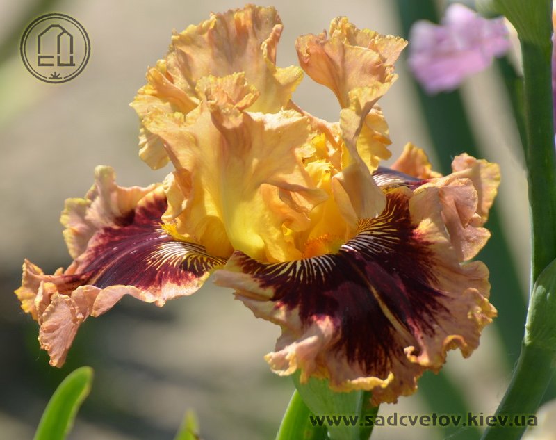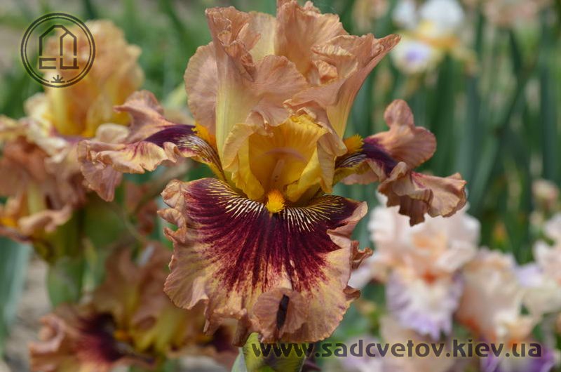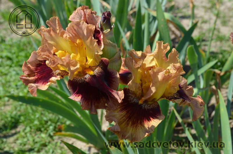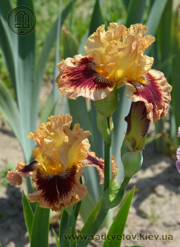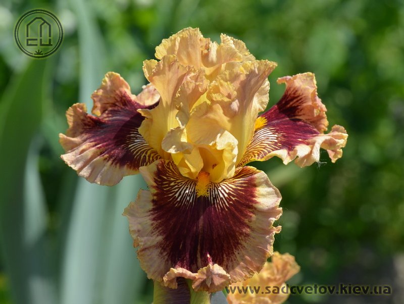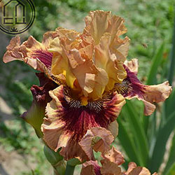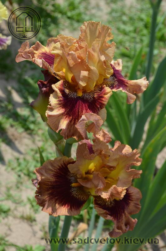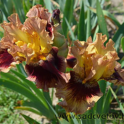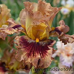 Гофрований та мереживний. ст. - світло-золоті в основі з плавним забарвленням до світло-лососевого кольору в мереживних краях, ф. - темно-червоні з широкою 2/3" гофрованою облямівкою блідого лососевого кольору, акуратний білий і яскравий жовтий візерунок поруч із яскраво-жовтими б..
