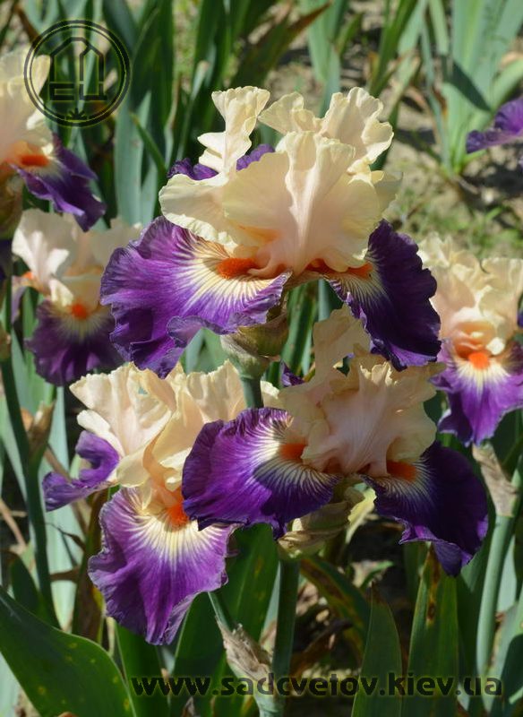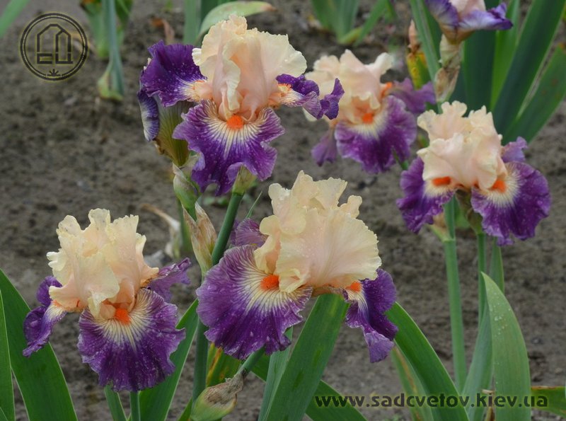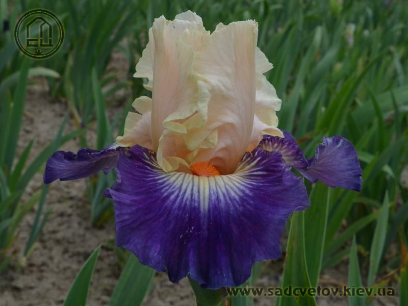 Хвиляста гофрована квітка. Ніжні кремово-рожеві ст .. На фіолетових з блакитним висвітленим краєм фолах густі персикові промені навколо великої яскравої червоно-оранжевої б ..