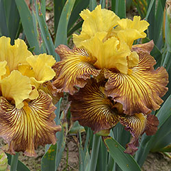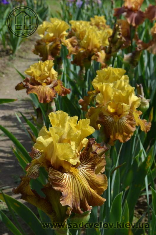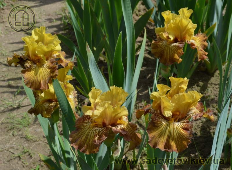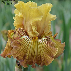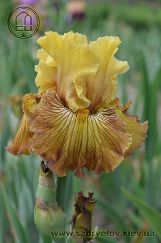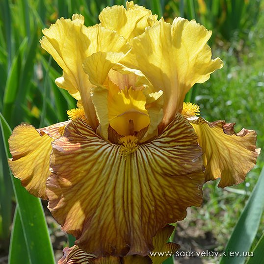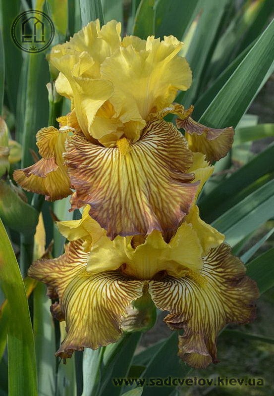 Гофрована квітка з широкими фолами. Світлі зеленувато-жовті ст. з легким рум'янцем розгалужених коричневих і лавандових прожилок. На ф. яскраво виражений контрастний малюнок прожилок помірного оранжево-жовтого і коричневого кольору по світлій зеленувато-жовтій основі висвітленій до білого біля яскраво-жовтої б.