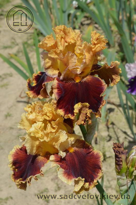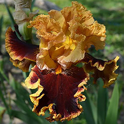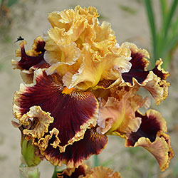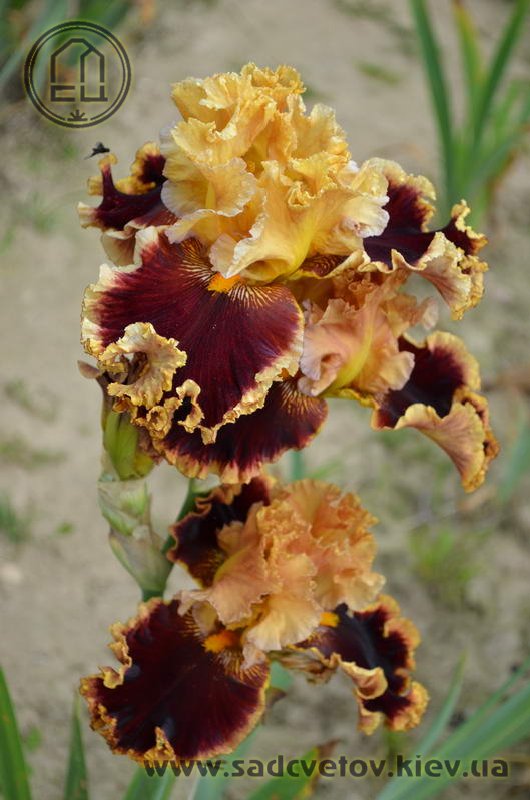 Супергофрована, мереживна квітка. Ст. - Світлого золотисто-коричневого кольору з зелено-жовтим стрижнем в срежніх жилках. Серединка мереживна з золотисто-жовтими кінчиками. Ф. - темні бордові, більш червоні з боків з широкою 1/4" світлою золотисто коричневою облямівкою по краю і невеликою люмінатою білих прожилок від бороди і жовтих в плечах. Б. - оранжеві з більш жовтим кінцем.