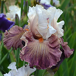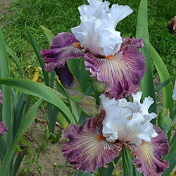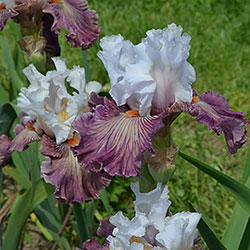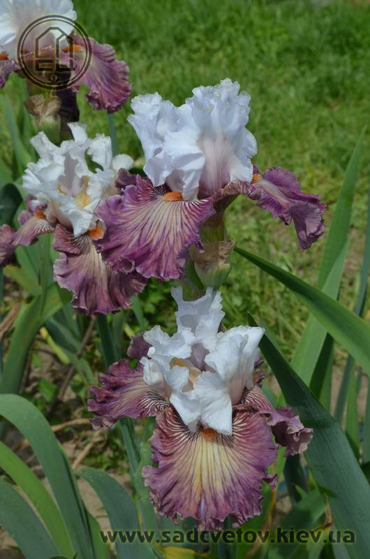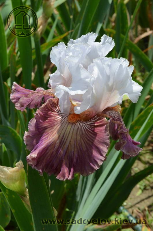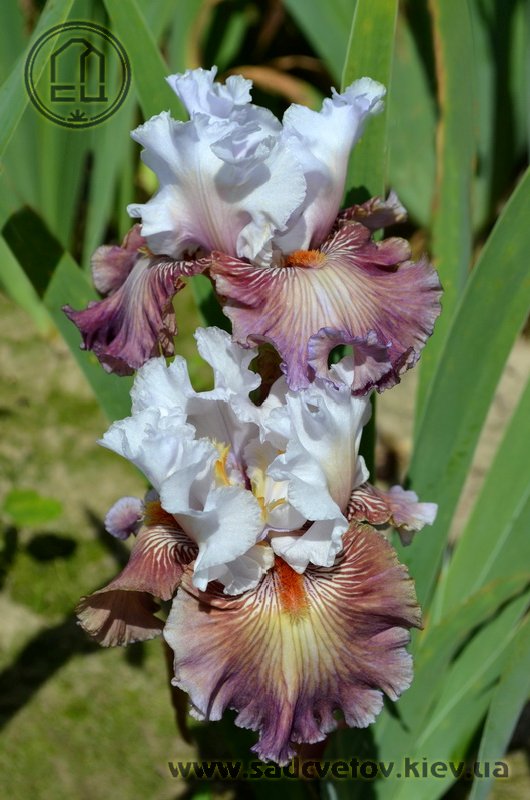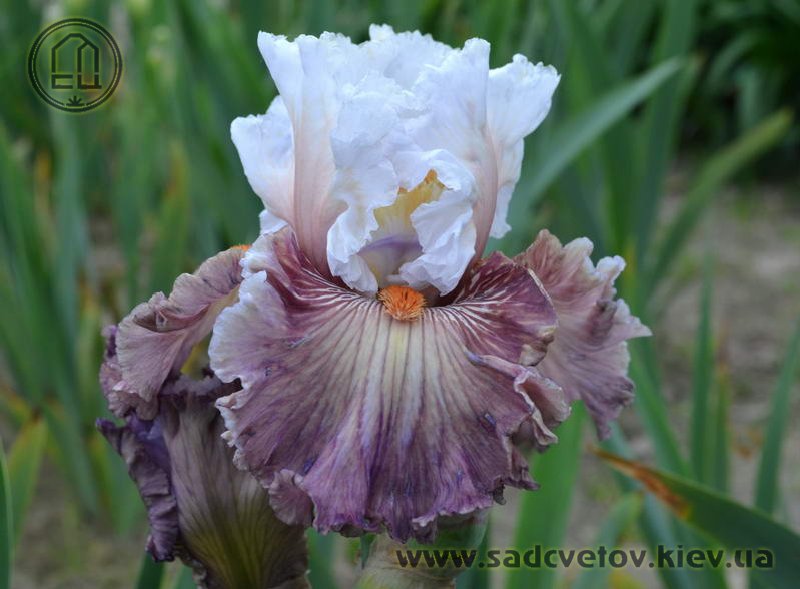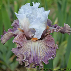 Добре гофрована квітка. Ст. - білий з золотисто-лавандовим рум'янцем, ф. - пліката, устрично-гірчична серединка в ореолі червоно-коричневих і фіолетових прожилок, невелика люміната світлих білих прожилок з боків бороди і тонке висвітлення кольору по краю фолів, б. - помірний оранжевий з устричних-гірчичним кінцем.