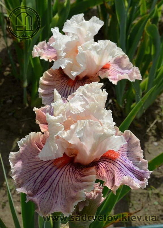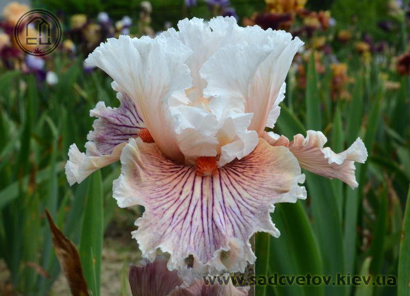 Прекрасно гофрована квітка. Ст. - кремовий білий з персиково-абрикосовим рум'янцем, серединка - така як стандарти з абрикосовими включеннями, ф. - кремовий рожево-білий з візерунком яскравих фіолетових прожилок навколо яскраво червоної бороди більш густих в плечах, які зникають за 1/2" від більш білого краю фолів.