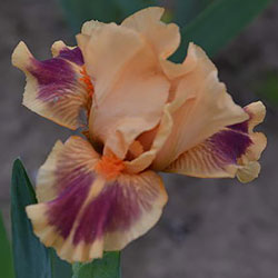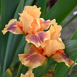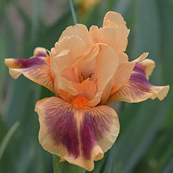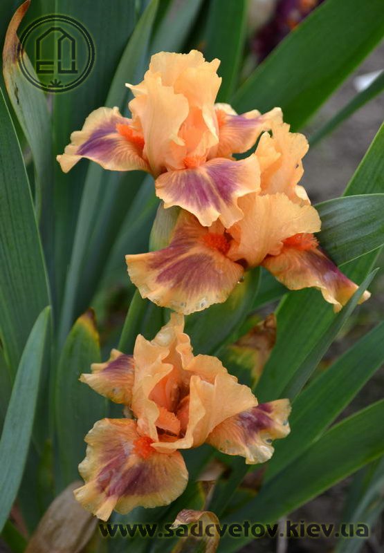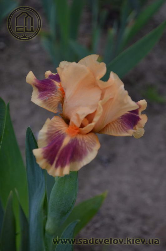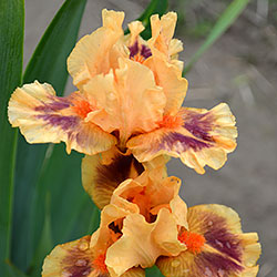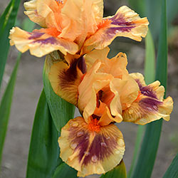 Гофрована абрикосова з оранжевими прожилками квітка, на фолах розсічена посередині малинова пляма яка створює 1/5" облямівку по краю, б. - лососєво-оранжева.