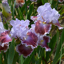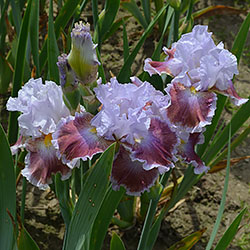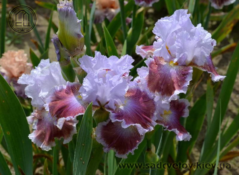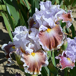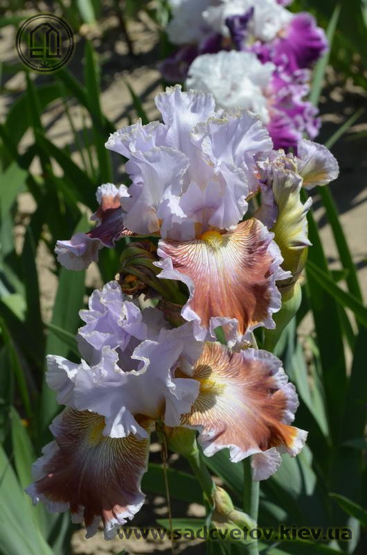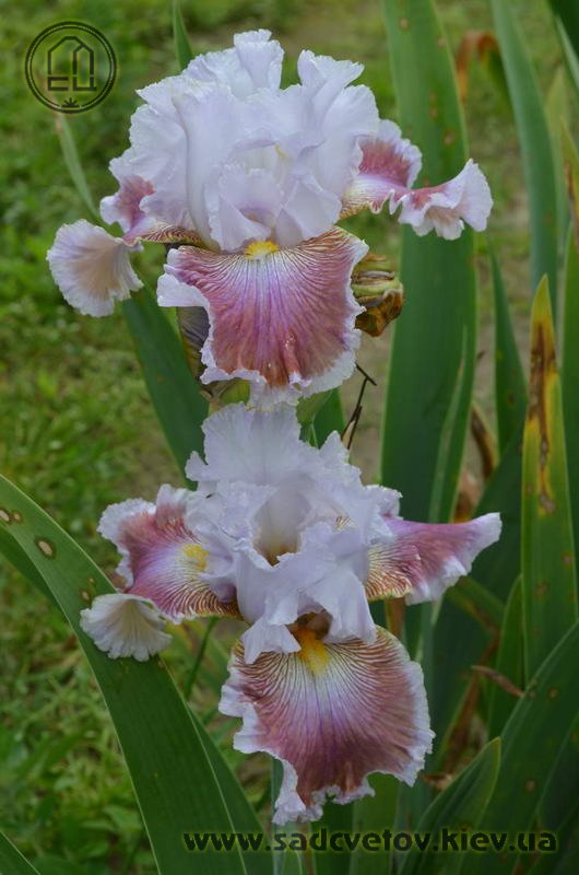 Гофрована квітка. Ст. - світло-блакитні з тонкою жовтою облямівкою по мереживному краю, ф. - червоно-коричневі, більш мандаринові до низу з 1/4" чіткою облямівкою кольору стандартів, світло-блакитне сяйво навколо бороди, полосатий візерунок прожилок в плечах. Б. - яскраві жовті з вибіленим кінцем.