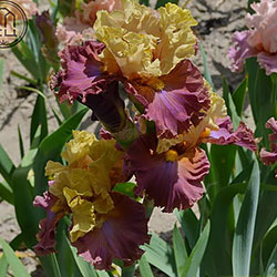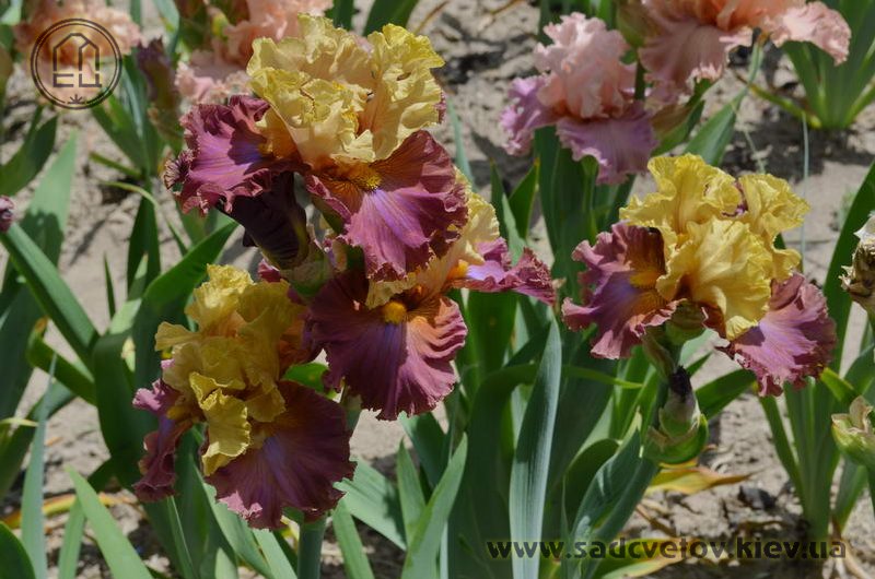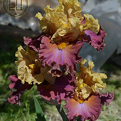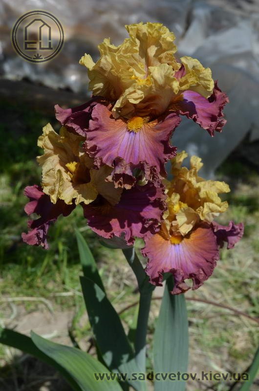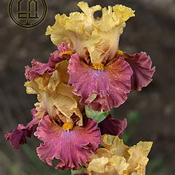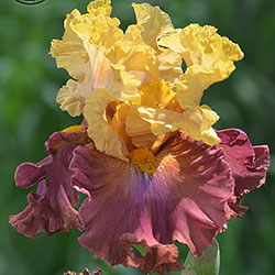 Добре гофрована квітка. Ст. - світлий зеленувато-жовтий з легким пурпурним рум'янцем і темними пурпуровими прожилками в стрижні, ф. - темний рожевий зі світлим пурпурно-блакитним вогником під борідкою, з боків від помірно жовтої борідки і в плечах присутність жовтого.