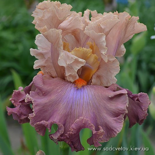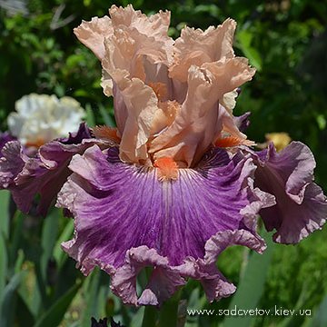 Велика гофрована квітка. Ст. - світлий абрикосовий з рожевим персиковим рум’янцем. Гілки маточки - такі як стандарти. Ф. - світлий рожево-бєжевий з широкою каймою кольору стандартів та невеличким білим візерунком прожилок з боків від бороди. Б. - приглушений насичений помаранчевий по білій основі.