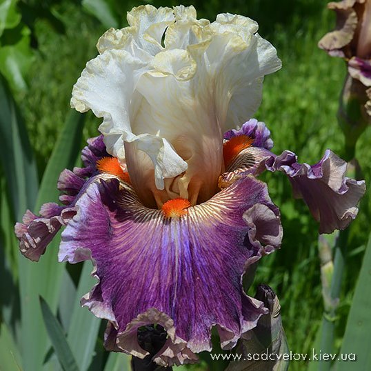 Добре гофрована квітка. Ст. - фіолетові з висвітленням в середині. Гілки маточки такі як стандарти з синім відтінком. Ф. - темні фіолетово-бордові з тонкою каймою кольору стандартів та активним білим візерунком з боків від бороди. Б. - приглушена помаранчево-коричнева по білій основі.