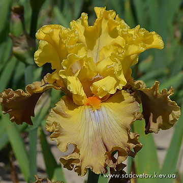 Прекрасно гофрована квітка. Ст. - яскравий жовтий. Гілки маточки - такі як стандарти. Ф. - гірчичний золотистий з золотисто-жовтими плечима та біло-лавандовим сигналом під бородою. Б. - яскрава оранжева.