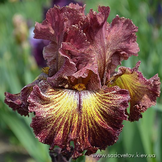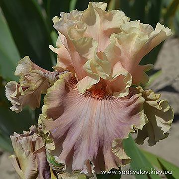 Добре гофрована квітка. Ст. - приглушені зеленувато-жовті з легким лавандовим рум’янцем. Гілки маточки такі як стандарти з абрикосовими та лавандовими включеннями. Ф. - темні червоно-бордові з дуже широкою до 1/2” бєжевою каймою, бежевою смужкою від бороди до низу та невеличким білим візерунком з боків від бороди. Б. - приглушені оранжеві з коричневим прошарком по кремовій основі.