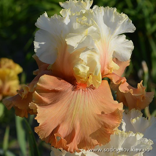 Добре гофрована квітка. Ст. - білі з вираженим лососєвим рум’янцем та тонкою золотистою каймою. Гілки маточки світло-абрикосові. Ф. - оранжеві з абрикосовим висвітленням під бородою та маленьким білим візерунком з боків від бороди. Б. - яскрава червоно-лососєва по низькій білій основі.
