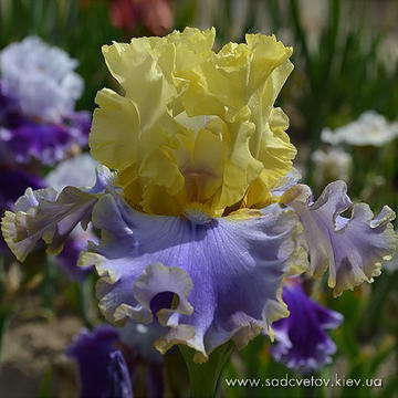 Прекрасно гофрований. Ст. - світлі оливково-золотисті з легким бузковим рум'янцем в середніх жилках. Ф. - блакитні з більш насиченим синім під білими з жовто-помаранчевим б. і жовтими плечима.