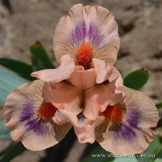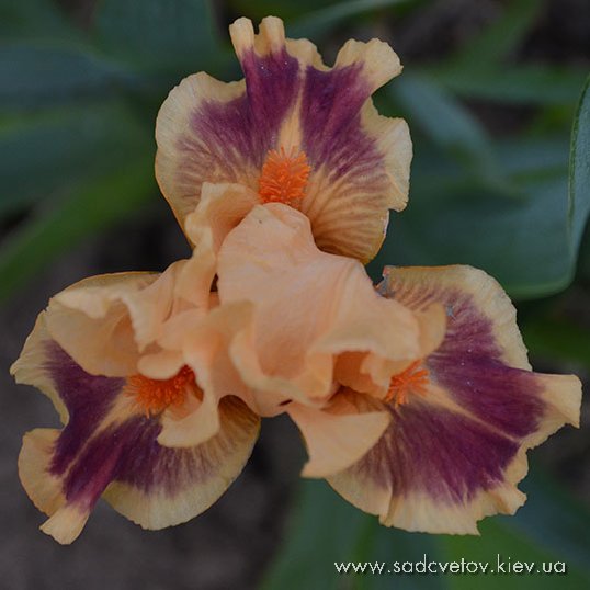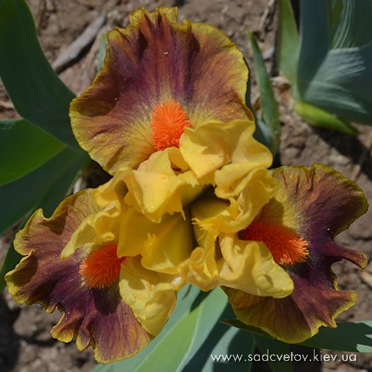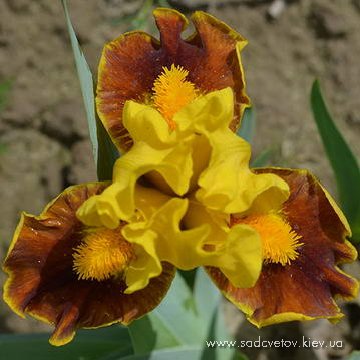 Гофрована квітка. С. - абрикосово-жовті. Серединка - зеленувато-жовта. Ф. - сливово-червоний під бородою який переходить в червоно-коричневий до гірчичних плечей з жовтим круговим висвітленням навколо бороди і тонкою каймою по краю. Б. - яскраві оранжеві.