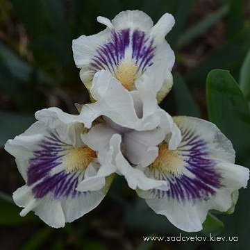Гофрована біла квітка з смугастою візерунчатою темно-фіолетовою плямою навколо б., що створює 1/4" облямівку, оливково-жовті плечі, б. - оранжеві кінчики по білій основі.